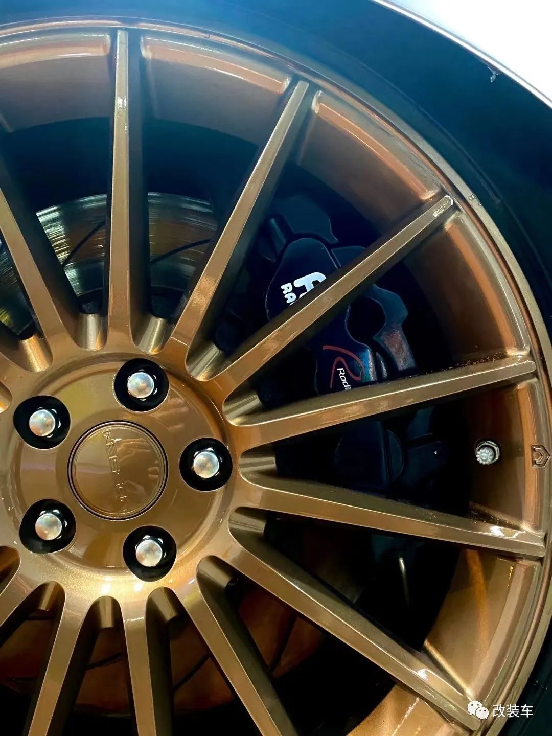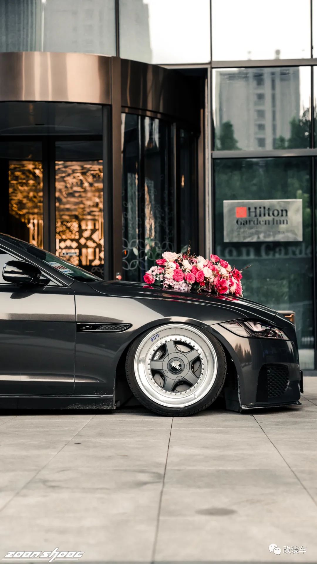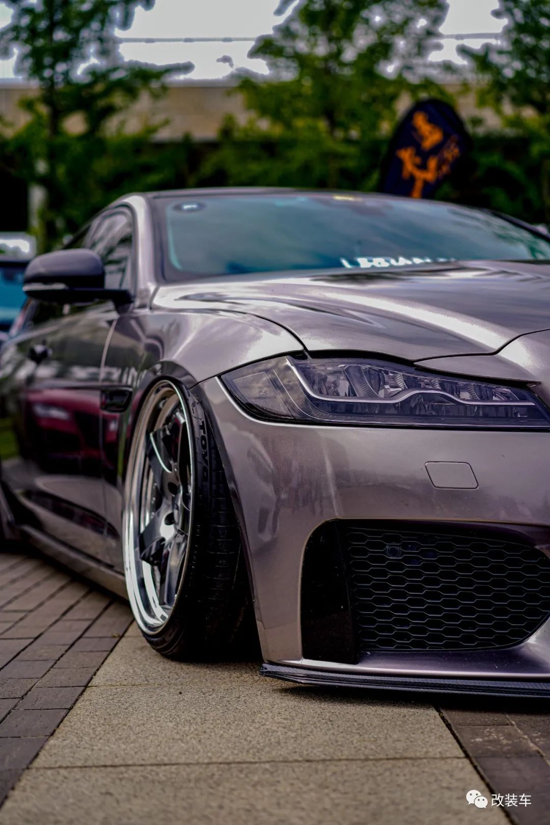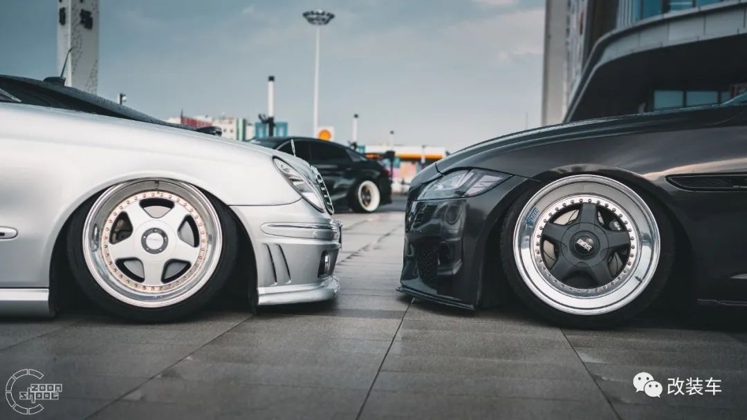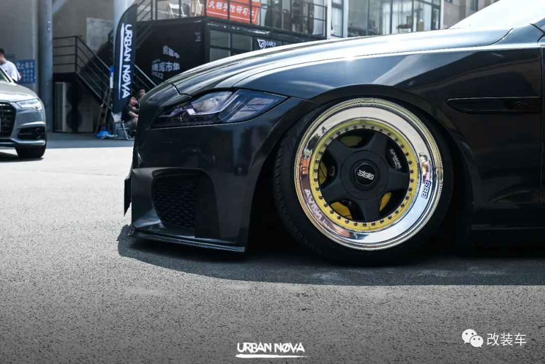 "这套17寸中片+17跳19抛边的BBS RF轮毂,搭配上倾角、束角拉杆等,最终做出了前后8度的倾角。不出意外的话,这应该是全国最大倾角的捷豹了!倾角与轮毂是我对这辆车最满意的地方了。"