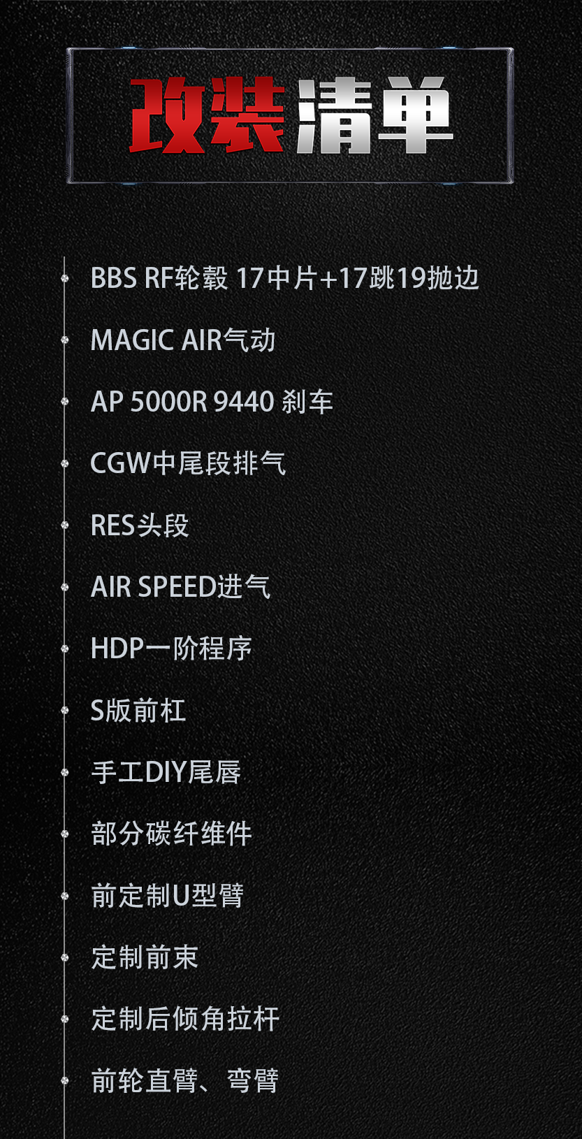 "这辆车的外观方面,还换上了S版前杠、手工DIY尾唇和一些碳纤维件等。"