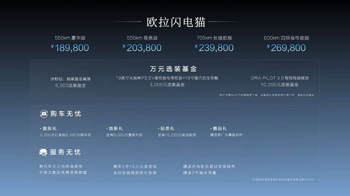 本次发布会,欧拉闪电猫公布四款车型,分别为600km四驱高性能版,综合补贴后售价26.98万元;705km长续航版,综合补贴后售价23.98万元;555km尊贵版,综合补贴后售价20.38万元;续航555km豪华版,综合补贴后售价18.98万元。此外还包含“无忧购车”、“无忧用车”、“选装折扣”三重惊喜上市权益。诚意十足的价格,让更多的年轻人、家庭用户都可以享受到闪电猫带来的惊艳之旅。