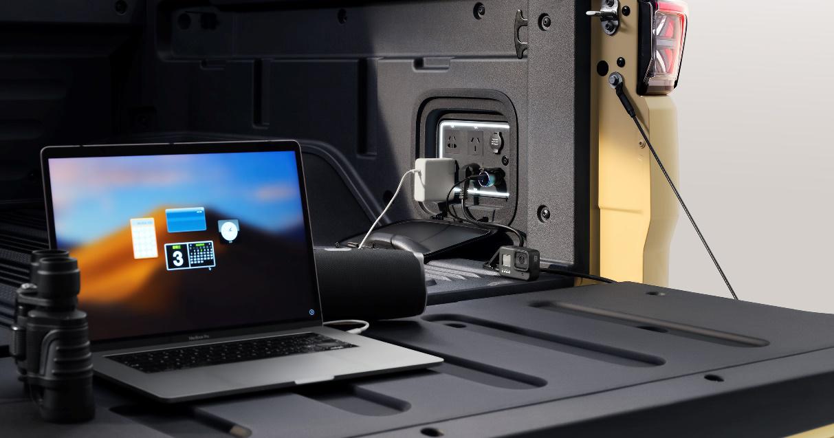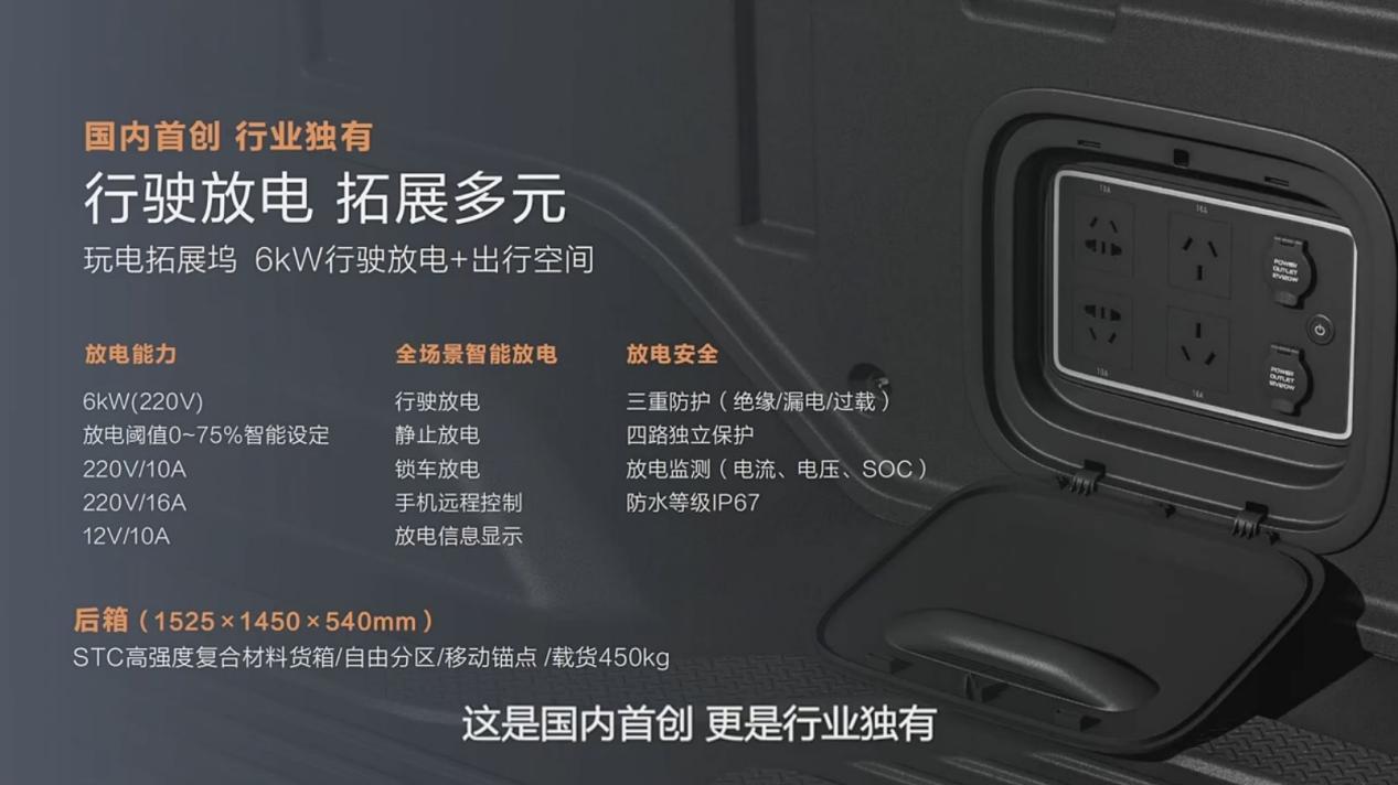 另外,雷达RD6另一大亮点就是在货舱内的右侧,多个电源接口,可实现静止中放电、移动中放电、V2V对车放电等,最高可支持15kW的放电输出。