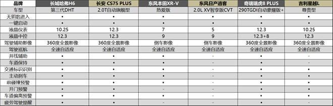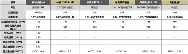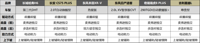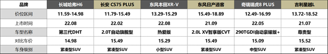 为便于直观的数据对比,本次入围车型均为近一年的上市新车。长城哈弗H6选择售价为14.98万元的第三代DHT(以下简称:哈弗H6)、长安CS75 PLUS售价为15.49万元的2.0T自动旗舰型(以下简称:长安CS75 PLUS)、东风本田XR-V售价为15.29万元的热爱版(以下简称:东本XR-V)、东风日产逍客售价为15.49万元的2022款 2.0L XV智享版CVT(以下简称:逍客)、奇瑞瑞虎8 PLUS售价为15.09万元的290TGDI自动豪耀版+(以下简称:瑞虎8 PLUS)、吉利星越L售价为15.52万元的尊贵型(以下简称:吉利星越L)!