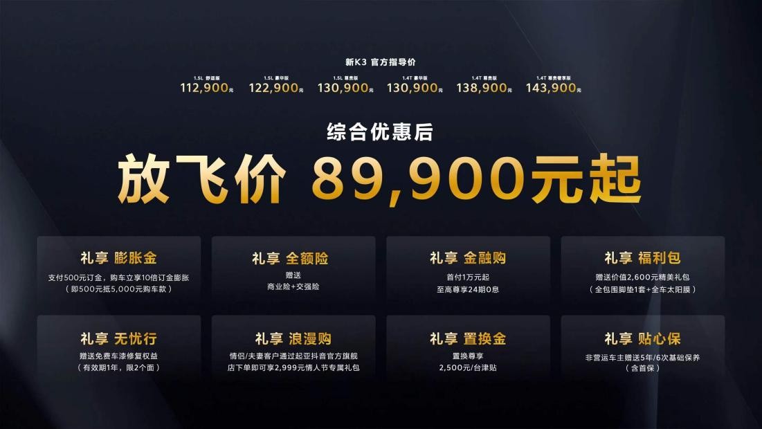日前,起亚旗下紧凑型轿车新起亚K3正式上市,新车共推出6款配置车型,官方售价11.29-14.39万元。同时官方还为消费者提包括礼享·膨胀金、礼享·全额险、礼享·金融购等共八重总价值不低于23000的购车礼,综合优惠后起售价仅为8.99万元起。配色方面新起亚K3新增了星际灰和星耀黄,进一步丰富了消费者的选择。