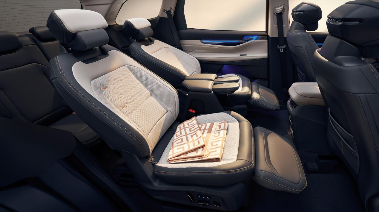 二排双悬浮式头等舱座椅带舒适腿托,配合三种模式一键切换近零重力模式,云端舒躺;座椅采用豪华的Dinamica材质,靠背角度可向后调节到41°, 靠背和大腿夹角可达105°,带来如悬浮云端般舒适惬意。空间上,最大膝部空间达到256mm,最大腿部空间1190mm,肩部空间1529mm,宽阔的横向空间,可以轻松装下儿童座椅。二排通道最窄距离达到200mm,加上可翻折座椅扶手,轻松出入第三排。而座椅通风、加热和独立温区控制、无线充电、便携杯架等配置的配备,让二排乘员轻松尊享“躺平”出行体验。