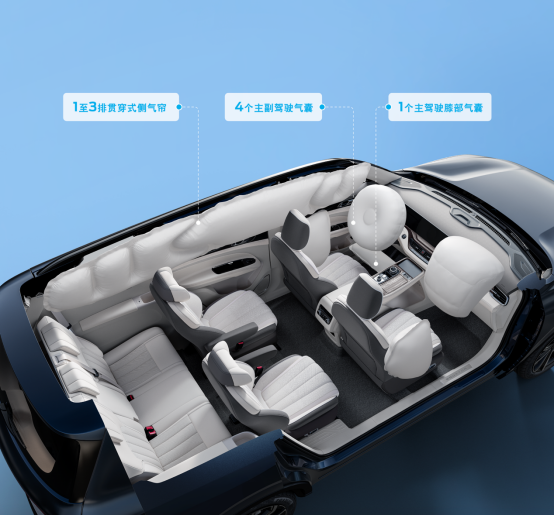 对于百年福特而言,安全和品质始终是福特坚守的底线。在被动安全方面,福特新领裕拥有同级领先的安全配置,为驾乘者带来越级安全感。全车车身主要由多种高强度钢组成,占比高达65.4%。其中热成型硼钢强度高达1500Mpa,达到航空飞机起落架的强度级别。高强度车身可有效抵御各方向的直接撞击,最大程度减小车身结构变形。全系标配7个安全气囊。同级独有的主驾驶膝部气囊以及一至三排贯穿式侧气帘,最大程度保障车内人员安全。