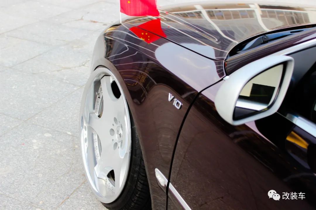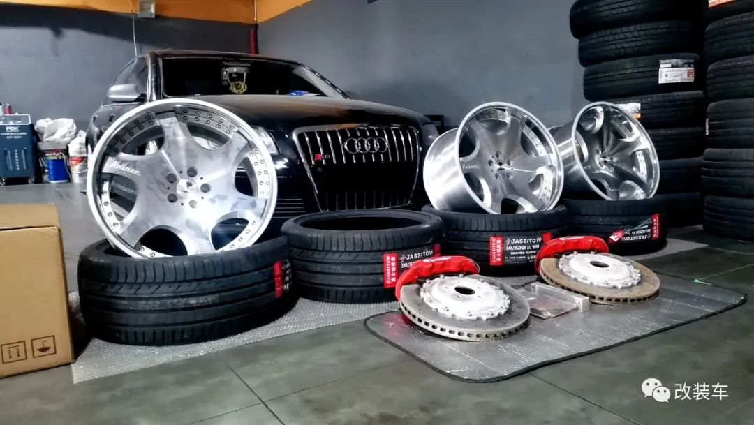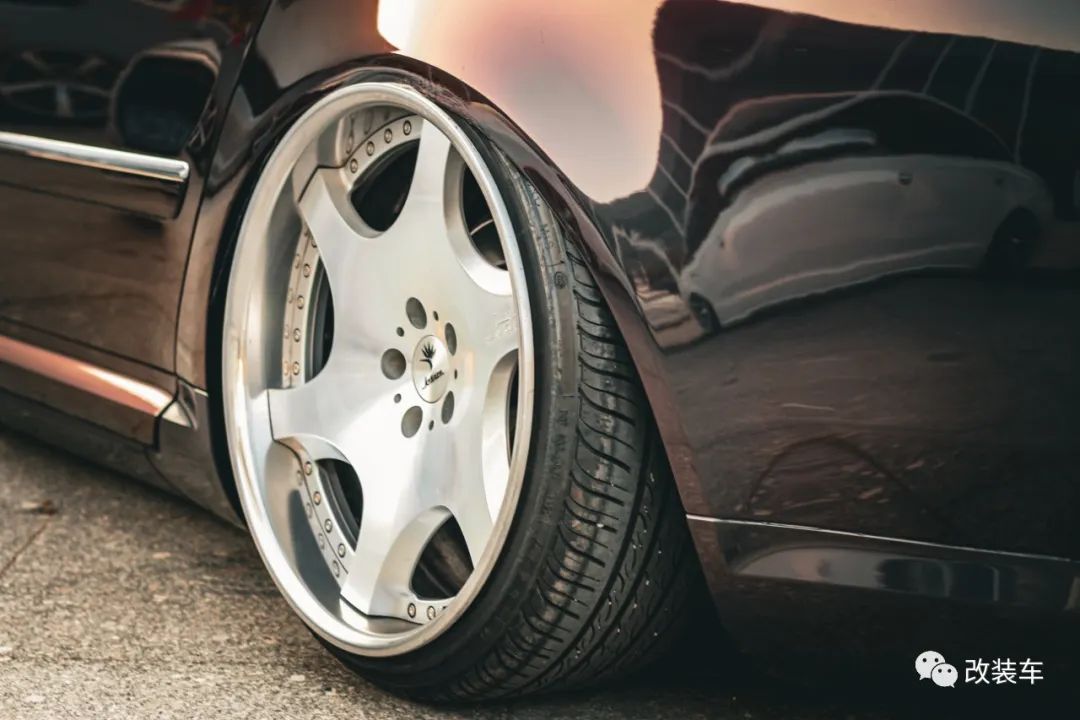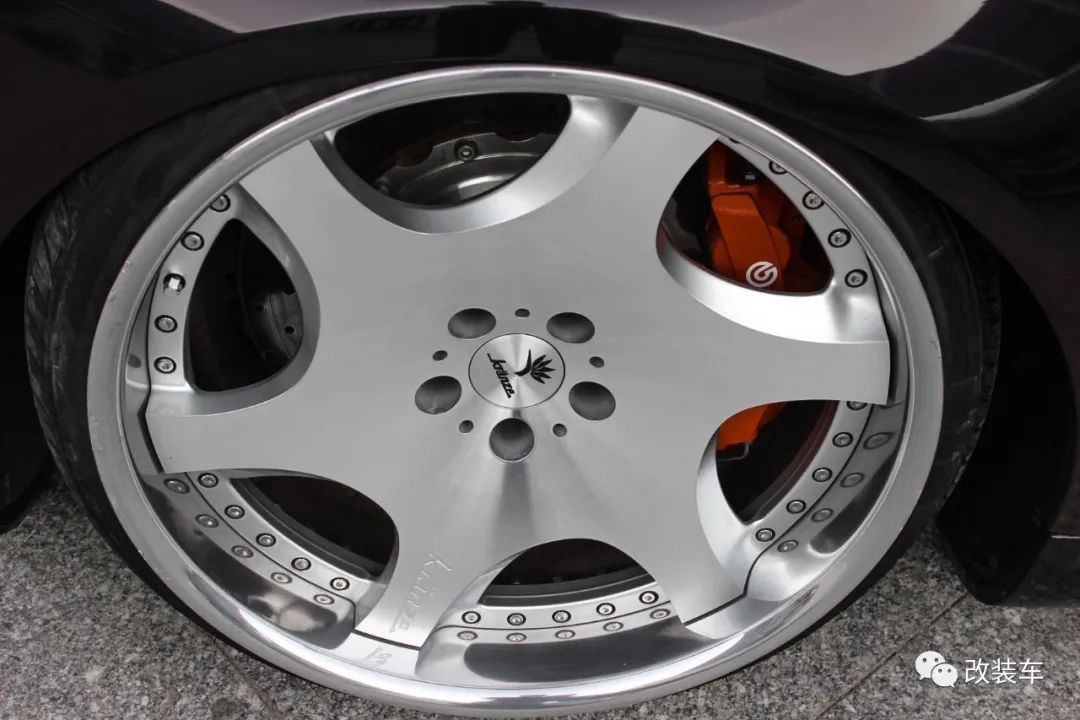 "首先是行走方面,换上了一套ACCU气动、一套20寸双片锻造大抛边轮毂,轮毂里面还藏着一套Brembo GT6刹车卡钳+405打孔通风盘,瞬间变得高大上起来。"