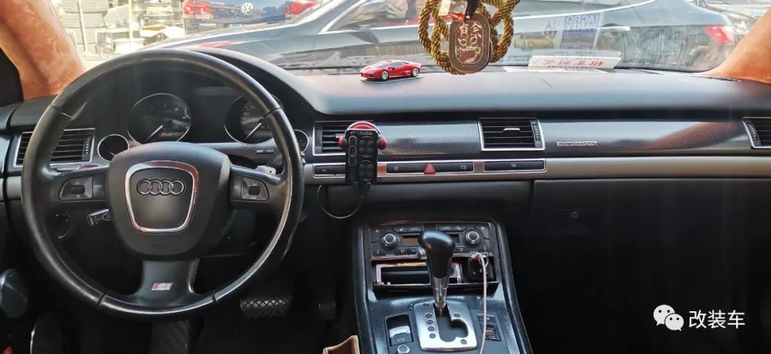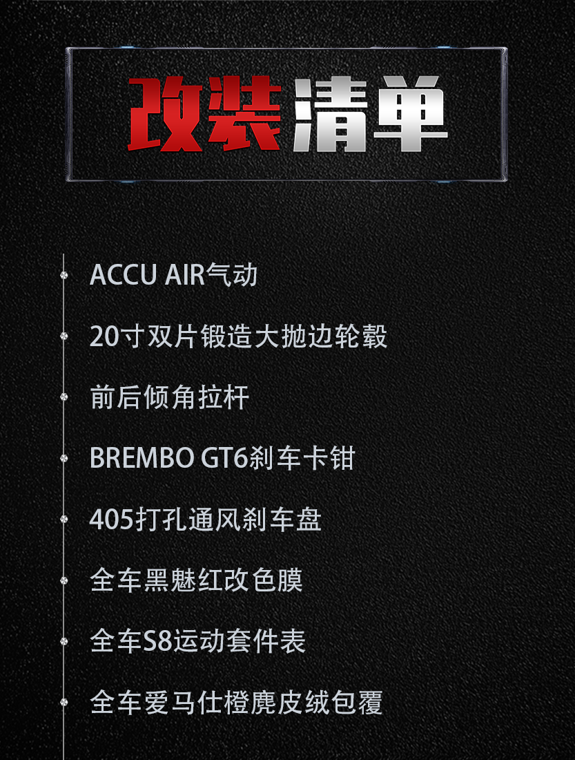 "外观方面,贴上了一身全车黑魅红改色膜,换上了全车奥迪S8运动套件,套件包括了前后杠、后尾箱盖、方向盘、仪表盘以及排气等,让车子又提升了个档次。"