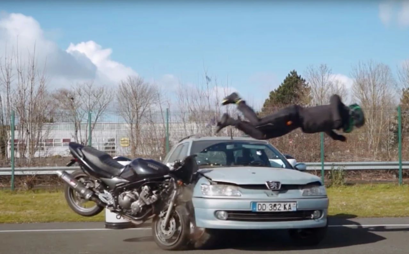 另外一个测试则是骑手以65km/h的速度撞向一辆标致汽车的侧面,因为惯性缘故骑手飞过汽车落在了一堆箱子里。虽然在撞击中骑手遭受了不小的冲击,但他并未受到严重伤害,这里也能看出膨胀起来的安全气囊裤,起到了应有的保护效果。