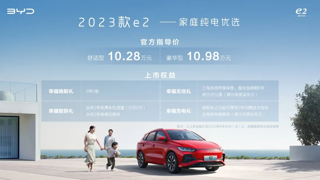 4月6日,比亚迪2023款e2焕新上市,售价10.28万元-10.98万元。据了解,4月30日前,订购该车型的用户可享受包括2年0息,全系2年免费车机流量(5GB/月),三电系统终身保修)等多重权益大礼。2023款e2是专为追求品质生活的家庭用户打造的纯电优选,凭借设计焕新、技术升级、智能进阶,将为更多家庭用户提供更时尚、更高效、更舒适的绿色出行新体验。
