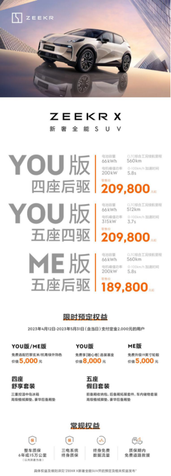 2023年4月12日,新奢全能SUV极氪X正式上市,官方零售价为: