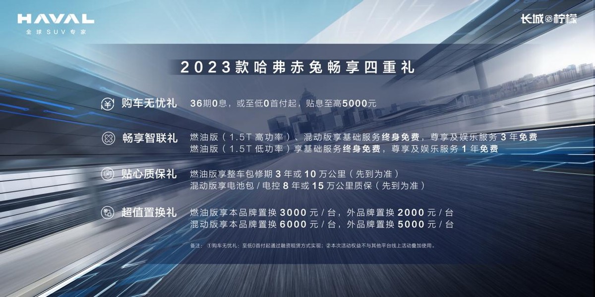 与此同时,为让更多年轻用户购车无忧,2023款哈弗赤兔贴心准备畅享四重礼,上市即有惊喜: