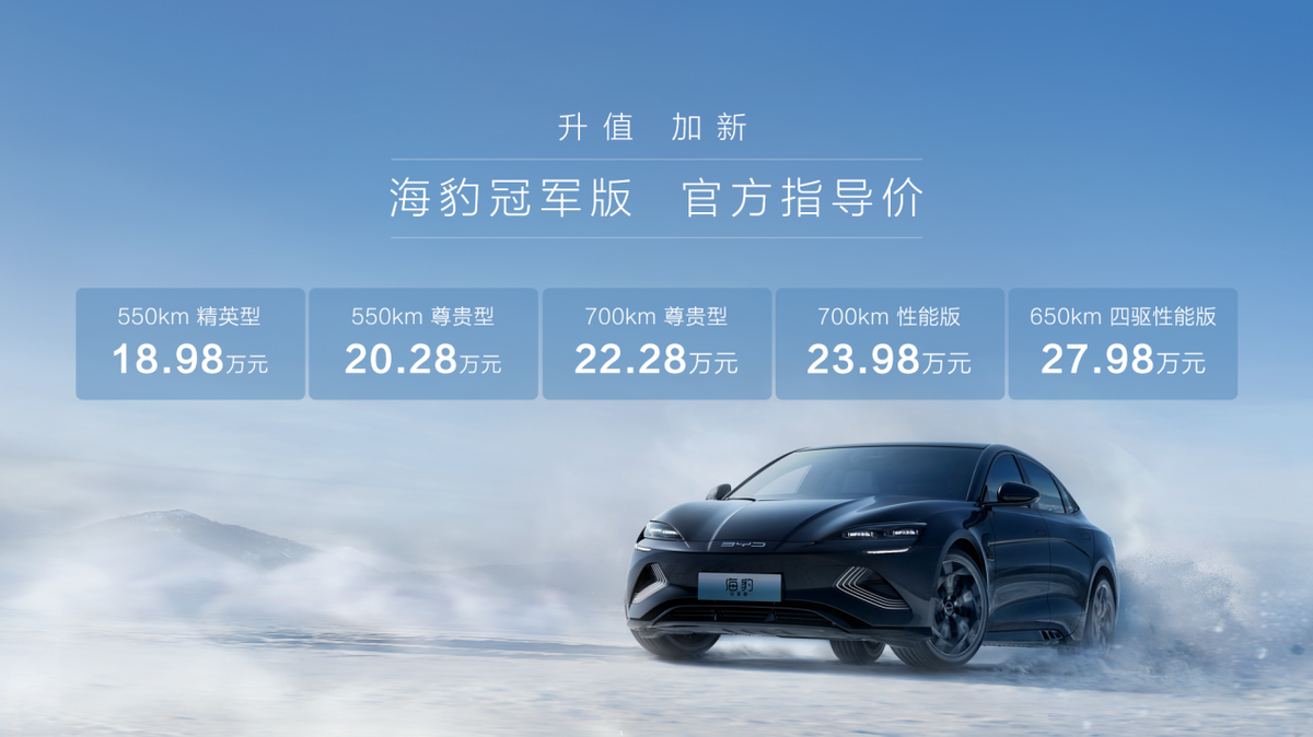 5月10日,“全新纯电轿跑”比亚迪海豹冠军版正式上市,新增700km尊贵型,五款车型售价为18.98万元-27.98万元。以海洋“豹”款的硬核实力为基础,海豹冠军版通过三大“升值”、两大“加新”,将以更具诚意的售价,巩固其在中级纯电市场的优势地位,全面提升用户价值。