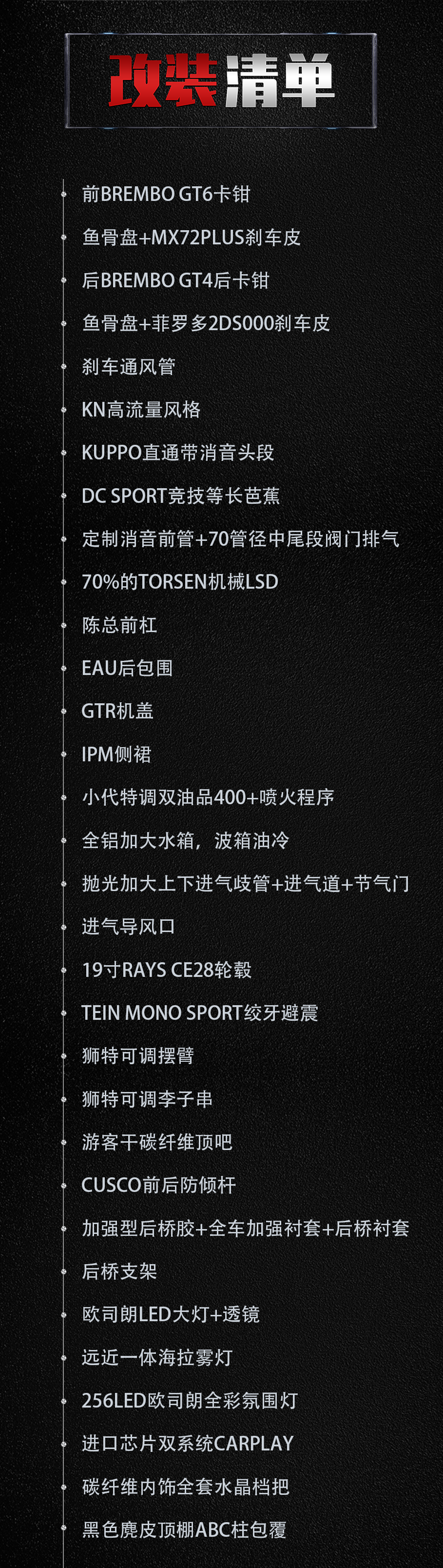 "操控方面除了避震的升级以外,还换上了70%的TORSEN机械LSD、狮特可调摆臂、狮特可调李子串、游客干碳纤维顶吧、CUSCO前后防倾杆、加强型后桥胶+全车加强衬套+后桥衬套,下了不少功夫来去调校它。"
