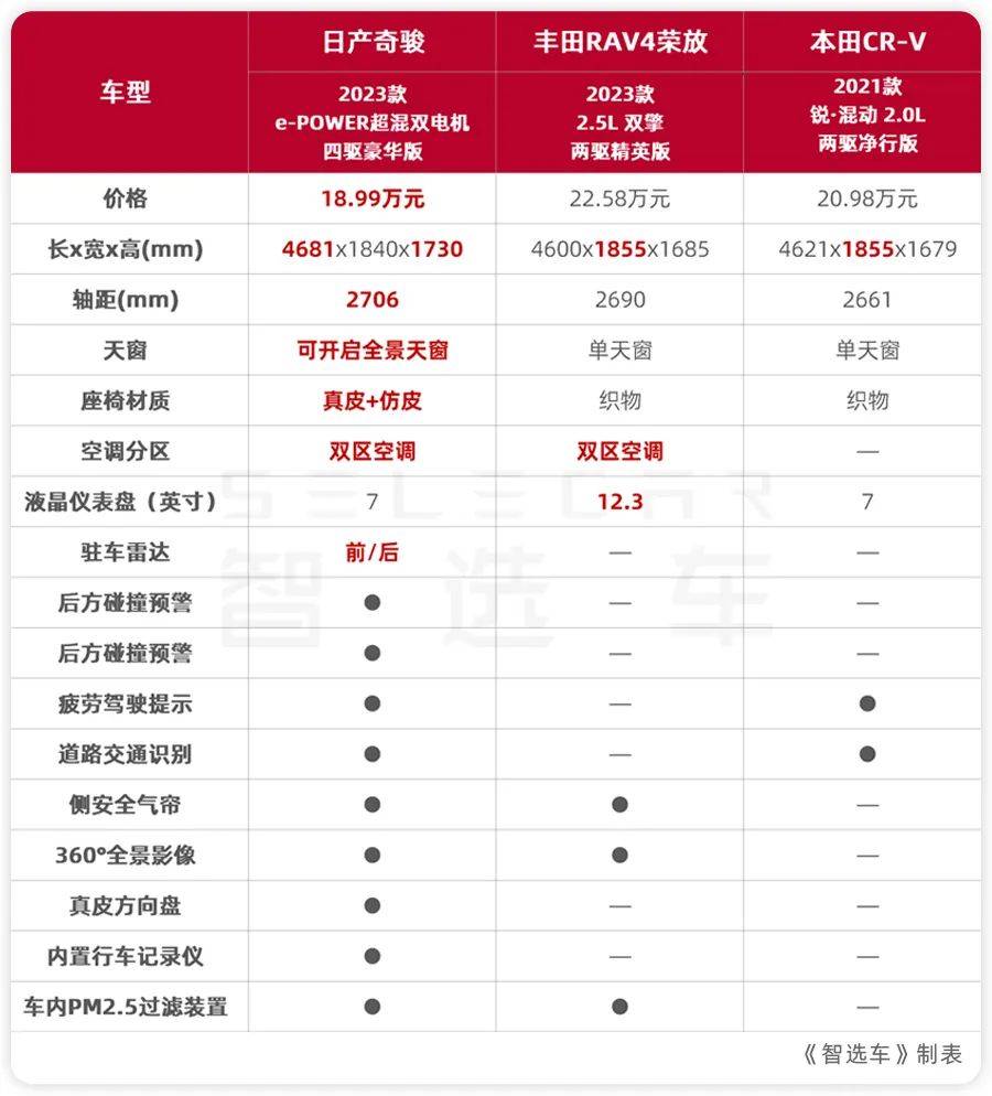 混动时代,日产奇骏的竞争对手依然包括丰田RAV4荣放、本田CR-V等车型。对比之下,超混电驱奇骏明显拥有更强的产品力。
