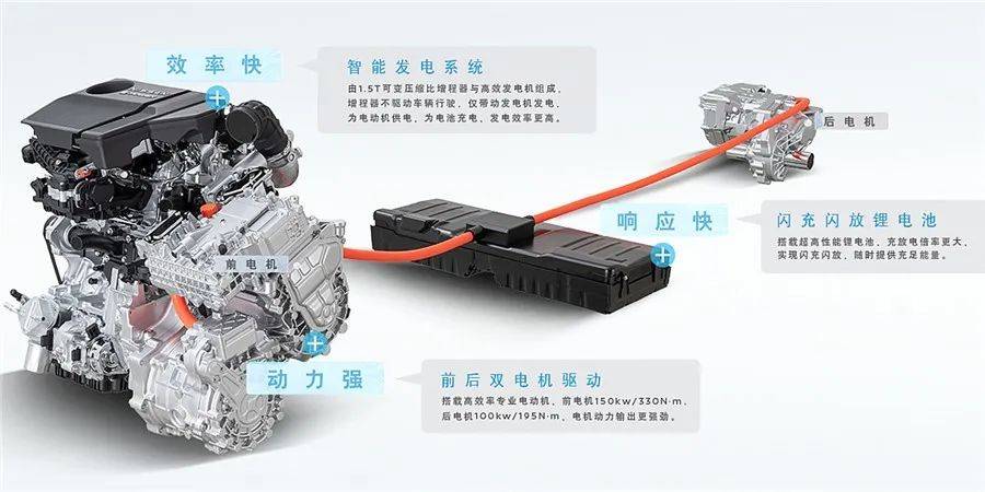 其中1.5T发动机最大功率为106kW,峰值扭矩为250N·m;前电机最大功率150kW,最大扭矩330N·m;后电机最大功率100kW,最大扭矩195N·m。