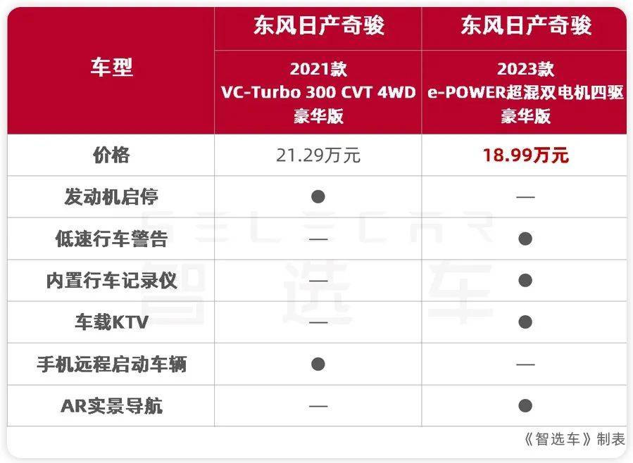 换言之,原来燃油版两驱车型的价格现在就能得到电混四驱,并且对应版本下,超混电驱奇骏的价格更低。如果与“两田”的混动四驱紧凑型SUV相比,超混电驱奇骏低了约5万元。