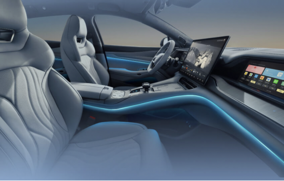 内饰方面,新车依旧延续了腾势D9车型的设计风格,搭载了六联屏,分别为17.3英寸中控屏、10.25英寸液晶仪表、10.25英寸副驾驶娱乐屏,AR-HUD以及双侧智能风口显示屏,科技感十足。