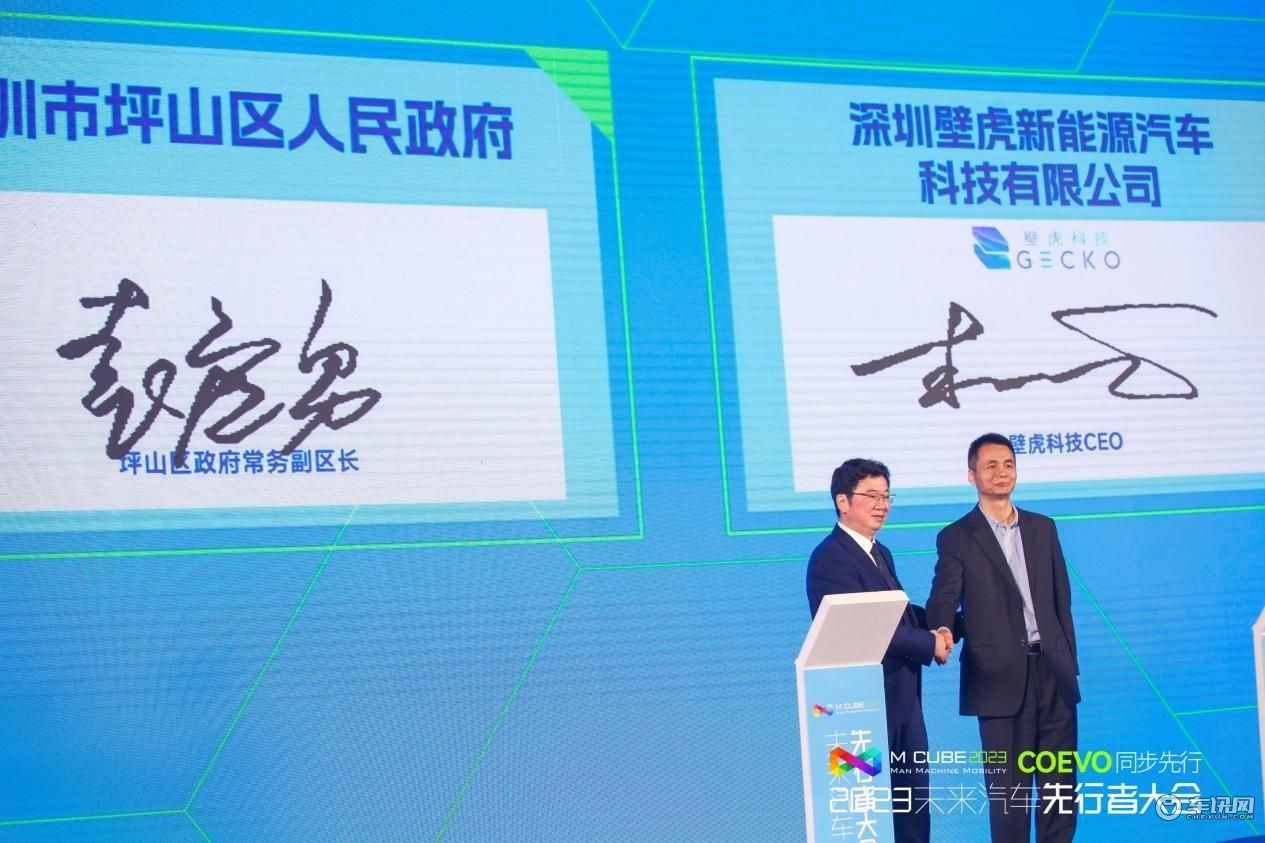 不仅如此,坪山区人民政府和壁虎新能源汽车科技有限公司,也在现场超过600名嘉宾和观众的见证下签约落户。这家以滑板底盘技术为核心的新能源商用车“汽车科技”企业“花”落坪山,标志着深圳市汽车产业再添一支新锐力量。