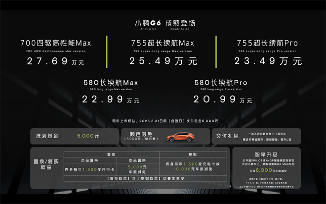 此外,小鹏G6还实现上市即交付,让用户立即体验到无与伦比的驾驶乐趣。更重要的是,首批用户将享受到多重尊享权益,包括价值5000元的选装基金、熔云橙外观色限时免费、交付礼包、复购/置换权益以及智享升级等多项购车权益。