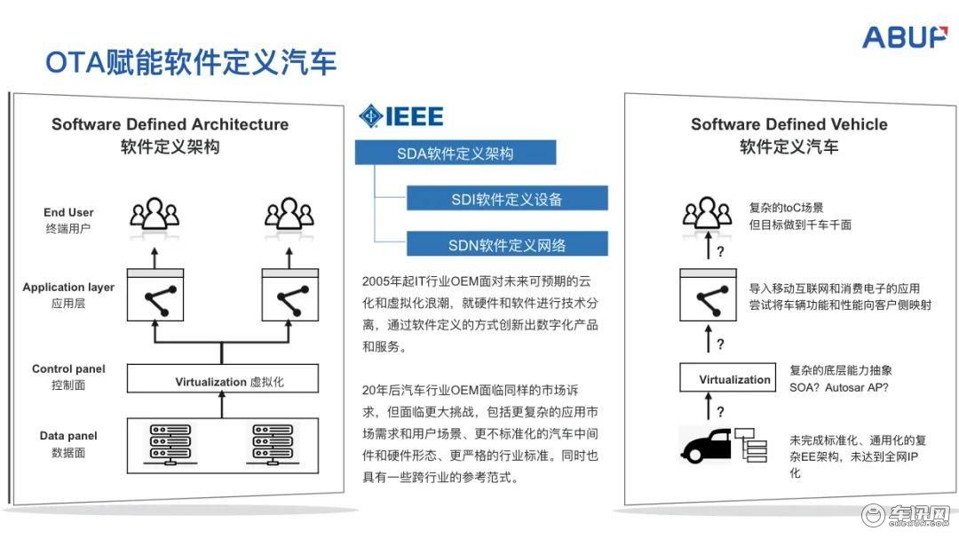 大家可以看到为了要实现软件定义,或者软件定义实现完成之后,在各个垂直行业标准化落地。比如IT领域里边有两个,一个是软件定义infrastructure,IDI、SDI,还有一个是软件定义网络,这些事情20年前已经做完。现在汽车专项应用领域,汽车行业开始要同样去做软件定义汽车这么一件事情。