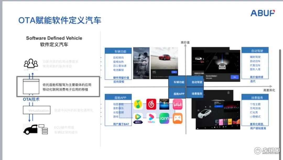 技术范式再往上看是应用层。当OTA技术搭建好之后,应用层可以大致分为这四类,可以通过价值的高低和功能差异化的大和小进行分类。