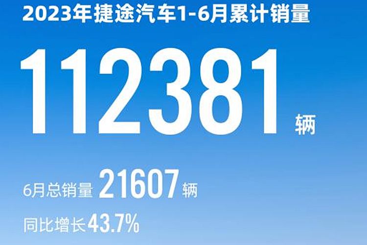 【车讯网 报道】2023年6月,捷途汽车销售21607辆,同比增长43.7%。今年上半年,捷途汽车累计销售112381辆,同比增长84.1%。自从捷途品牌发布至今,捷途汽车累计销量已达到76万辆。