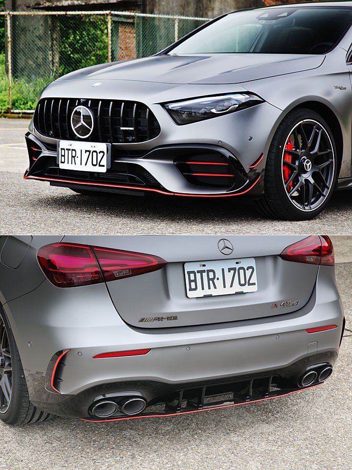 小改款 A 45 S 4Matic+除了延续车系的外观变动设计,在灯组及水箱护罩等细节有所差异外,此回试驾的车款更特别选配了原厂称之为 Street Style Edition 套件,套件内容在外观部份含括了 AMG 进阶空力套件、消光灰车色以及 AMG 赛车贴饰等,此外试驾车款还额外选配了 19 吋锻造铝圈,将 A 45 S 4Matic+的外观妆点得更为凶悍,也更能凸显出其高性能化的钢砲特质。