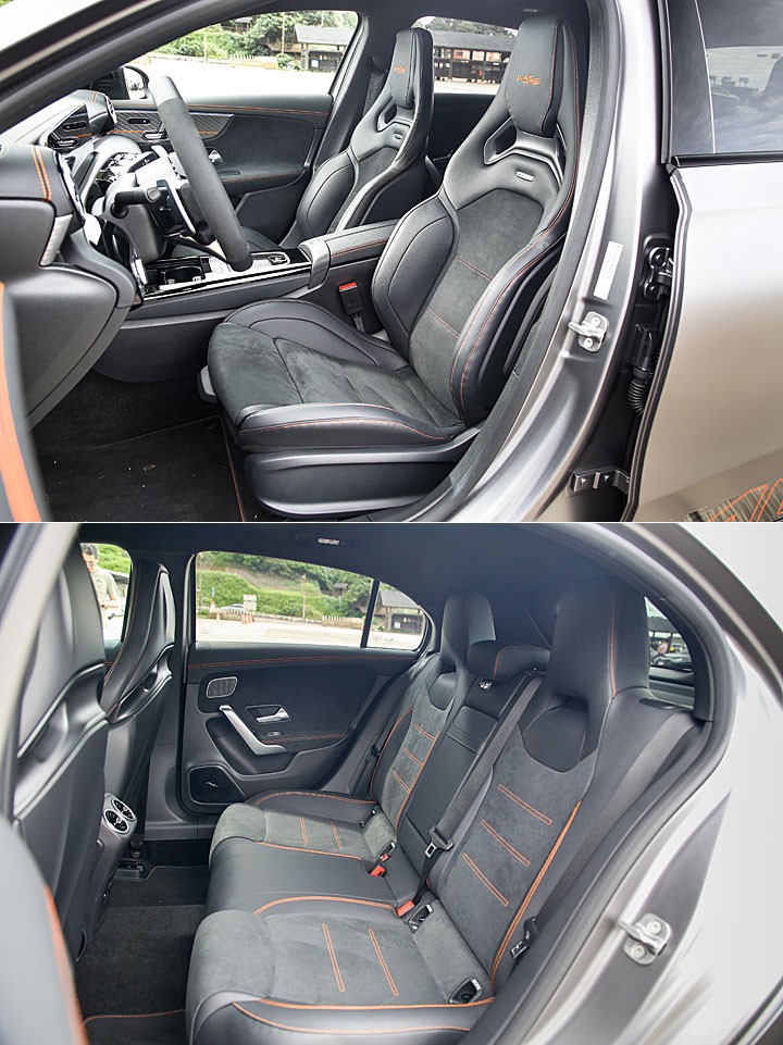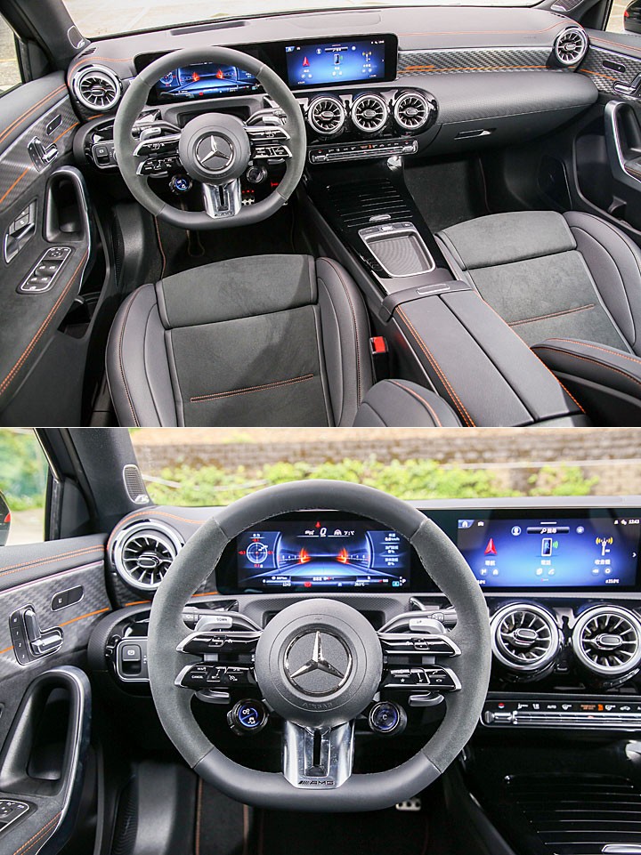内饰部份,A 45 S 4Matic+透过选配 Street Style Edition 套件后,亦呈现出极为浓郁的战斗风格。首先是两张双前座椅皆改采 AMG 高性能赛车坐座椅,除了采用皮质与麂皮相搭之外,并加入了专属的橘色缝线,头枕上方更具备 A 45 S 绣刻字样,另外包含中控台、门板以及中央扶手等处,也全数施以皮质包覆搭配橘色缝线,再加上搭配方格纹图案及橘色 AMG 字样的饰板设定,以及专属的平底跑车化多功能方向盘,使其无论是质感或是视觉效果,都较标准车型更上一层。