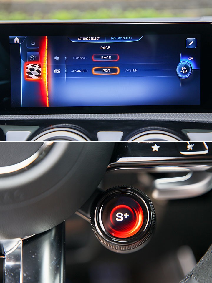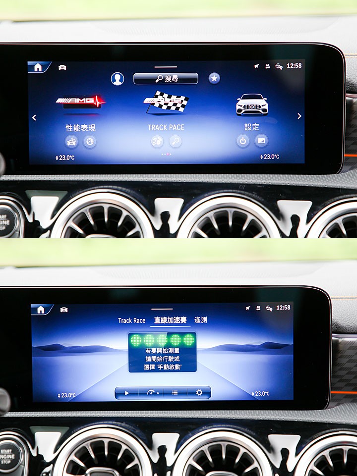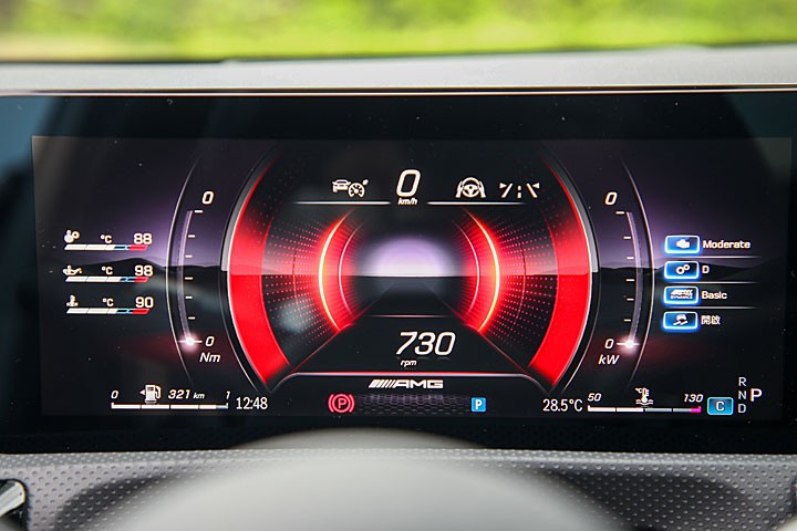 在列为小改款全车系标配的 10.25 吋数位仪表及 10.25 吋中控荧幕基础下,A 45 S 4Matic+在仪表部份加入了更多与性能相关的显示机能,除了较为传统的双环仪表显示模式下,亦具备了运动、狂野以及 A 45 S 4Matic+专属的 Track Pace 模式,可提供包含瞬间 G 值、油门及刹车使用幅度,以及引擎水温及油温等实时信息。