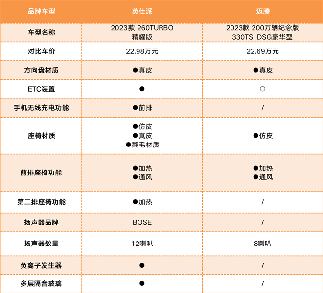 配置上,英仕派更是没有一般合资车“抠门”的毛病。除了座椅上配备的多项调节以及便利性配置之外,BOSE音响、真皮方向盘、流媒体后视镜等豪华配置也是说给就给,给人带来很不一样的品质魅力。同级别的迈腾,则拿出了常规合资车的诚意,不过便利性上却相差不少,比如手机无线充电,迈腾就没有给到,落后英仕派三五年的水平。