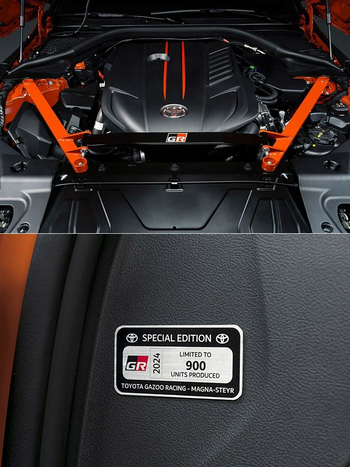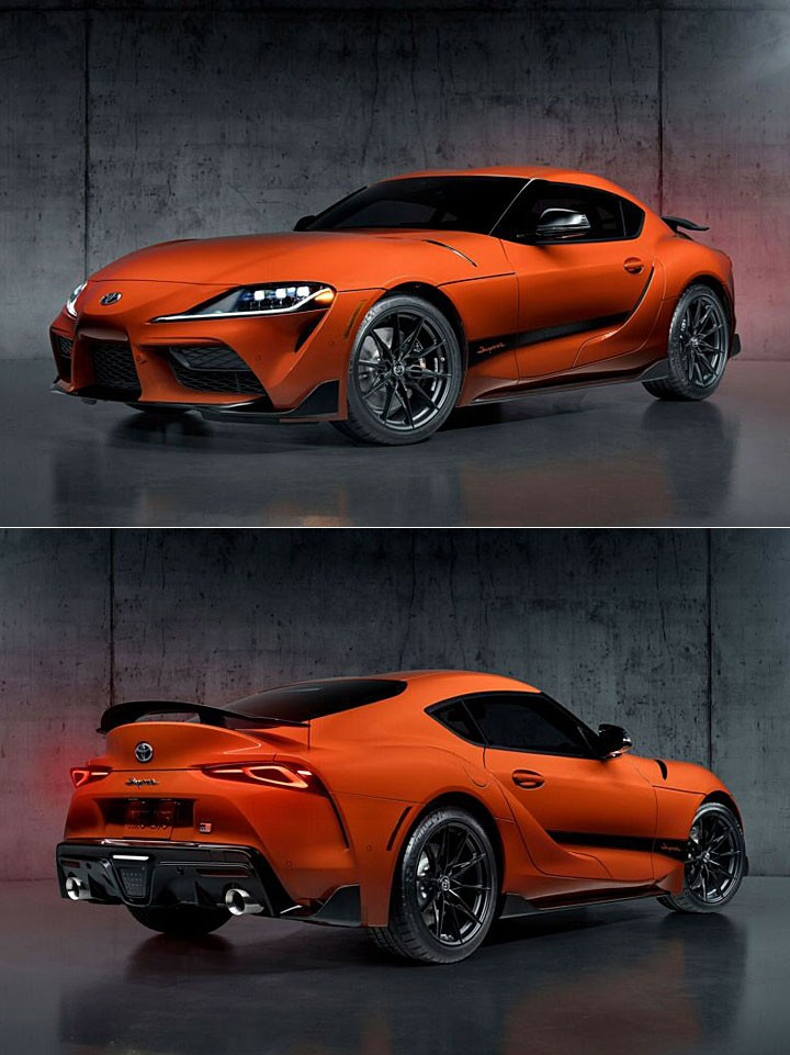 于新年款首见的 45 周年纪念版车型,采限量 900 辆方式发售,在外观配置上向经典的第 4 代 Supra 车系致敬,并提供特殊的金属橘色及白色涂装选择,两款颜色各生产 450 辆,并搭配车侧黑色饰条及 Supra 字样,车尾则追加黑色固定式尾翼配置,并可手动调节尾翼角度,足下则采用 20 吋锻造黑色铝圈搭配黑色涂装卡钳,透过专属配色强调纪念版车型的独特设计。