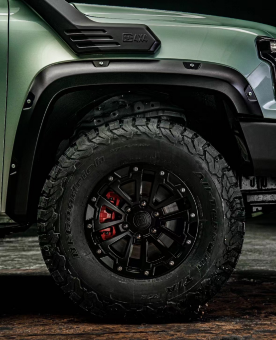 概念版“大道飞将”装配315/70 R17的百路驰KO2全地形轮胎,带来了巨幅的通过性提升,再搭配内嵌铆钉的宽体轮眉来覆盖外扩的轮圈,以威武霸气之姿,诠释“大将风范”。“大道飞将”拥有前210mm、后220mm的悬挂总行程,处于硬派越野第一梯队水平,在炮弹坑及交叉轴路况下可大大增加轮胎的贴地机率;所搭载的K-MAN油气分离式外置氮气罐避振器,在非铺装路段也能产生更强的支撑与回弹抑制效果,如履平地。根据不同路况、载重及驾驶风格,驾驶员还可通过旋钮对压缩阻尼进行自定义调节。除了避振器,“大道飞将”的其余悬挂部件也配合底盘升高及轮距加宽进行了相应强化,包括加长上下控制臂、加长半轴等,共同组成了悬挂部分的整体性能升级方案。