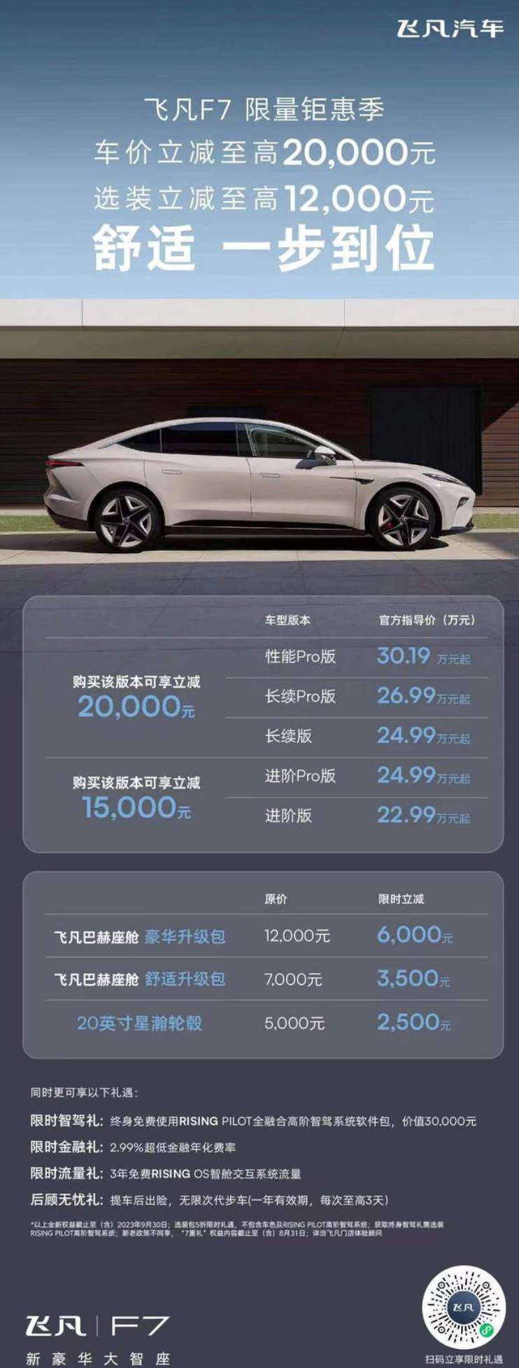 飞凡汽车在本届成都车展上正式发布车联融合方案——飞凡巴赫座舱数字生态,并公布了飞凡F7限时政策,现车可至高立减20000元。