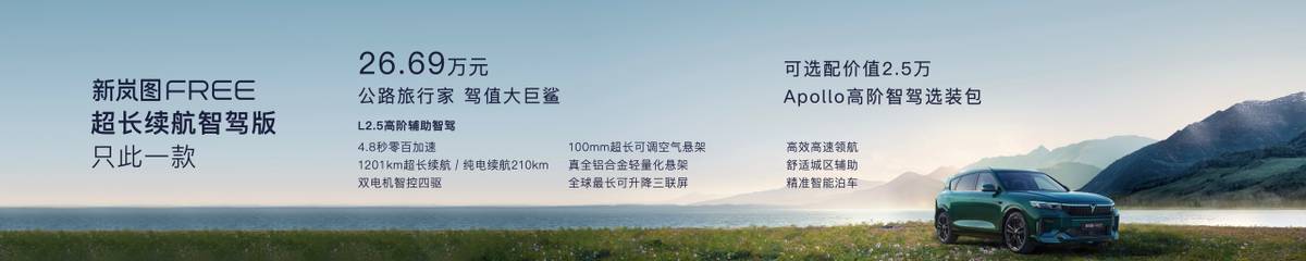在2023 VOYAH NIGHT岚图用户之夜上,新岚图FREE以26.69万元的价格正式打入25万-30万元的市场区间,其搭载百度阿波罗领航辅助智驾、标配全铝悬架和空气悬架、拥有1201km超长续航,成为了这一级别车型少有的竞争力强者。更为重要的是,新岚图FREE全车系只推出一个版本,即新岚图FREE超长续航智驾版,而官方给出的理由是:免去用户的选择“困扰”。