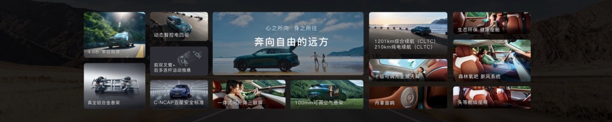 在性能上,新岚图FREE采用前160kW后200kW双永磁同步电机,整车最大功率可达360kW,峰值扭矩720N·m,零百加速最快可达4.8s。在操控性上,新岚图FREE采用动态智控电四驱,配备前双叉臂后多连杆运动独立悬挂以及全铝合金底盘,相比钢制底盘轻30%。此外,采用的高性能空气悬架支持上下100mm高度调节,配备毫秒级随速可调系统,匹配经济、舒适、高能、郊游、自定义五种驾驶模式。