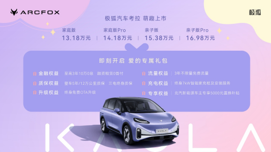 9月20日,“全球首款智能亲子车”——极狐汽车考拉正式宣告上市,共推出四款配置车型,官方指导售价13.18万元-16.98万元。随同新车上市,极狐汽车考拉还发布了一系列“爱的专属礼包”上市权益,包括:至高3年10万元0息、融资租赁0首付金融权益,整车5年/12万元公里质保、三电终身质保权益,3年不限量免费流量、终身免费OTA升级权益,终身智能家充桩及安装服务,以及北汽新能源车主专享的5000元置换补贴权益。