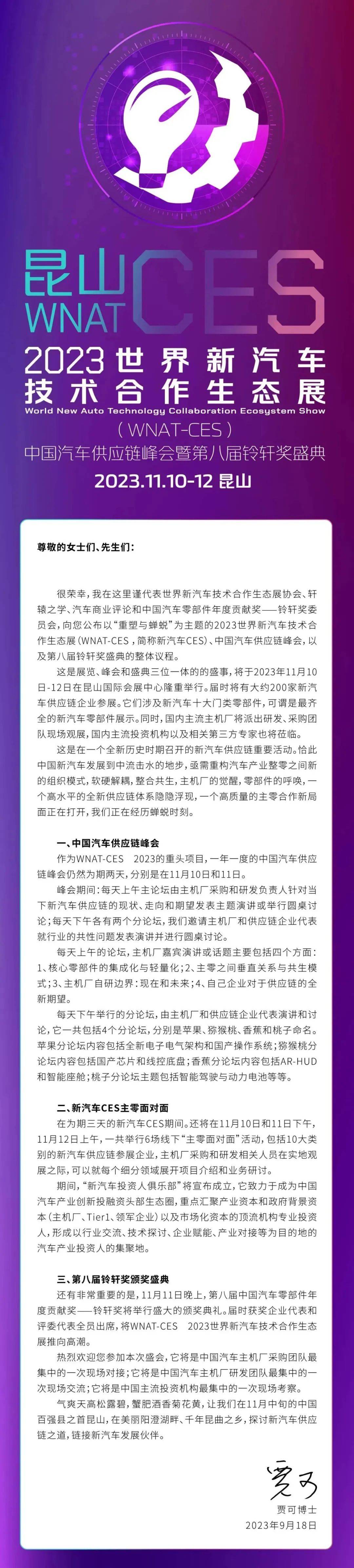铃轩奖评审团主席贾可博士表示,第八届铃轩奖颁奖盛典将在11月10日-12日于昆山首次举行的世界新汽车技术合作生态展上举行,同期还将举行一年一度的中国汽车供应链峰会。展览、峰会和盛典三位一体,共同打造新汽车技术合作生态圈,欢迎有识之士届时一起共襄盛举。