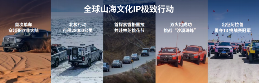 今年,长城炮山海文化共创官,与用户共赴山海、共享山海。山海炮首次单车穿越亚欧非大陆;北极行动,行程2万8千公里,成功抵达北极圈;探索香格里拉、共赴林芝桃花节;双火炮 1分35秒 成功挑战“沙漠珠峰”;出征阿拉善 勇夺长城炮T3挑战赛冠军。