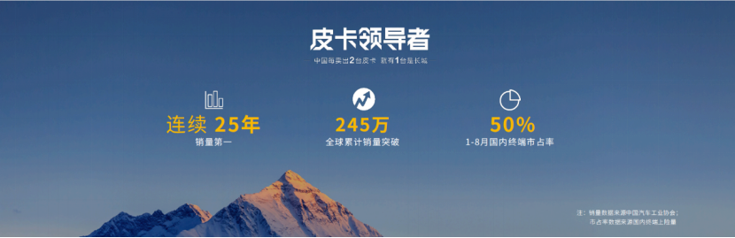 中国只有两种皮卡,一种是长城,一种是其他。长城皮卡已连续25年销量第一,全球累计销量突破245万。今年1-8月长城皮卡国内/出口销量双第一、乘商双赛道增速第一,国内终端市占率近50%,中国每卖出两台皮卡,就有一台是长城。长城炮已累计35个月销量过万,蝉联皮卡销量冠军。今年8月18日长城炮品牌四周年,迎来第50万台整车下线,成为首个突破50万台的中国高端皮卡品牌,以现象级的“长城炮速度”,开启中国智能豪华皮卡新篇章。