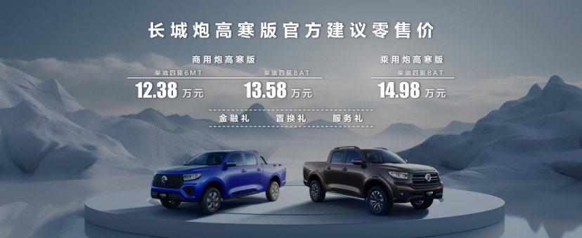 商用炮高寒版官方指导价12.38万元-13.58万元,乘用炮高寒版官方指导价14.98万元。同时,购车用户还将享受三重大礼:1、金融礼:购车客户可享受2年0息金融政策;2、置换礼:享受5000元高额置换补贴;3、服务礼:发动机和变速器享受4年或10万公里超长质保。物超所值,诚意满满。
