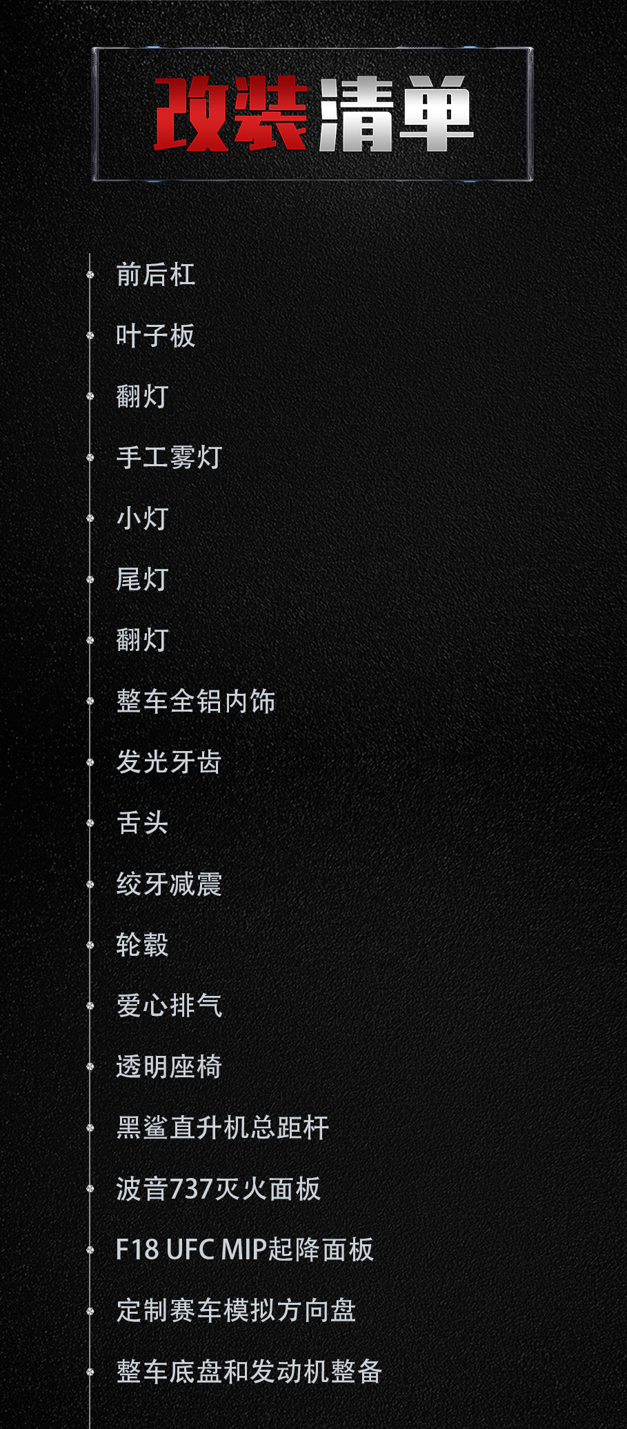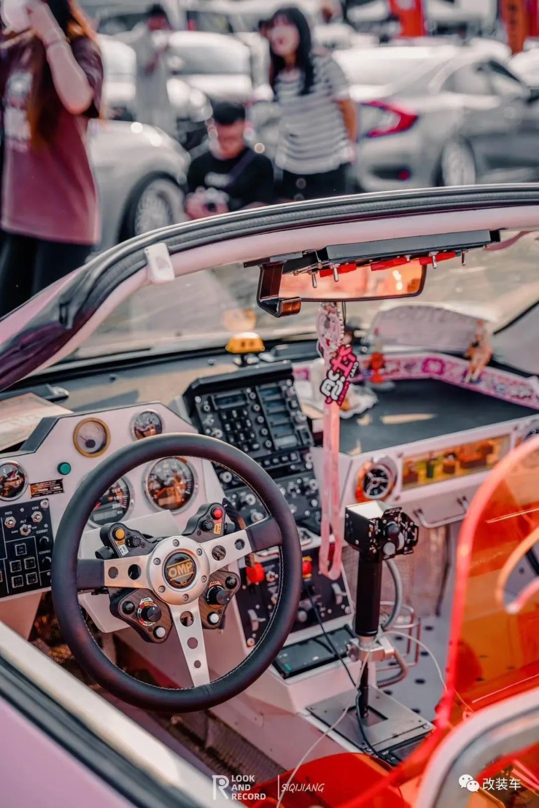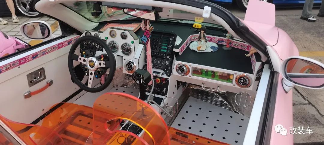 "我个人比较偏向于另类、反差的改装感觉,外观够可爱了,那么内饰就来点硬核的吧!换上了透明座椅、黑鲨直升机总距杆、波音737灭火面板、f18 ufc mip起降面板、定制赛车模拟方向盘(全部按键可以控制车辆转向和灯光),坐进内饰的感觉仿佛在开战斗机。"