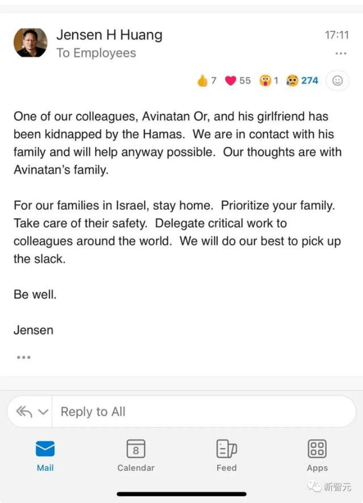 英伟达首席执行官黄仁勋(Jensen Huang)透露,该公司驻以色列的近400名员工已经被征召入伍,并确认英伟达多位员工及前员工在哈以冲突中丧生。英伟达的工程师Avinatan Or和他的女朋友Noa Argamani被哈马斯武装分子从周末的音乐节绑架。