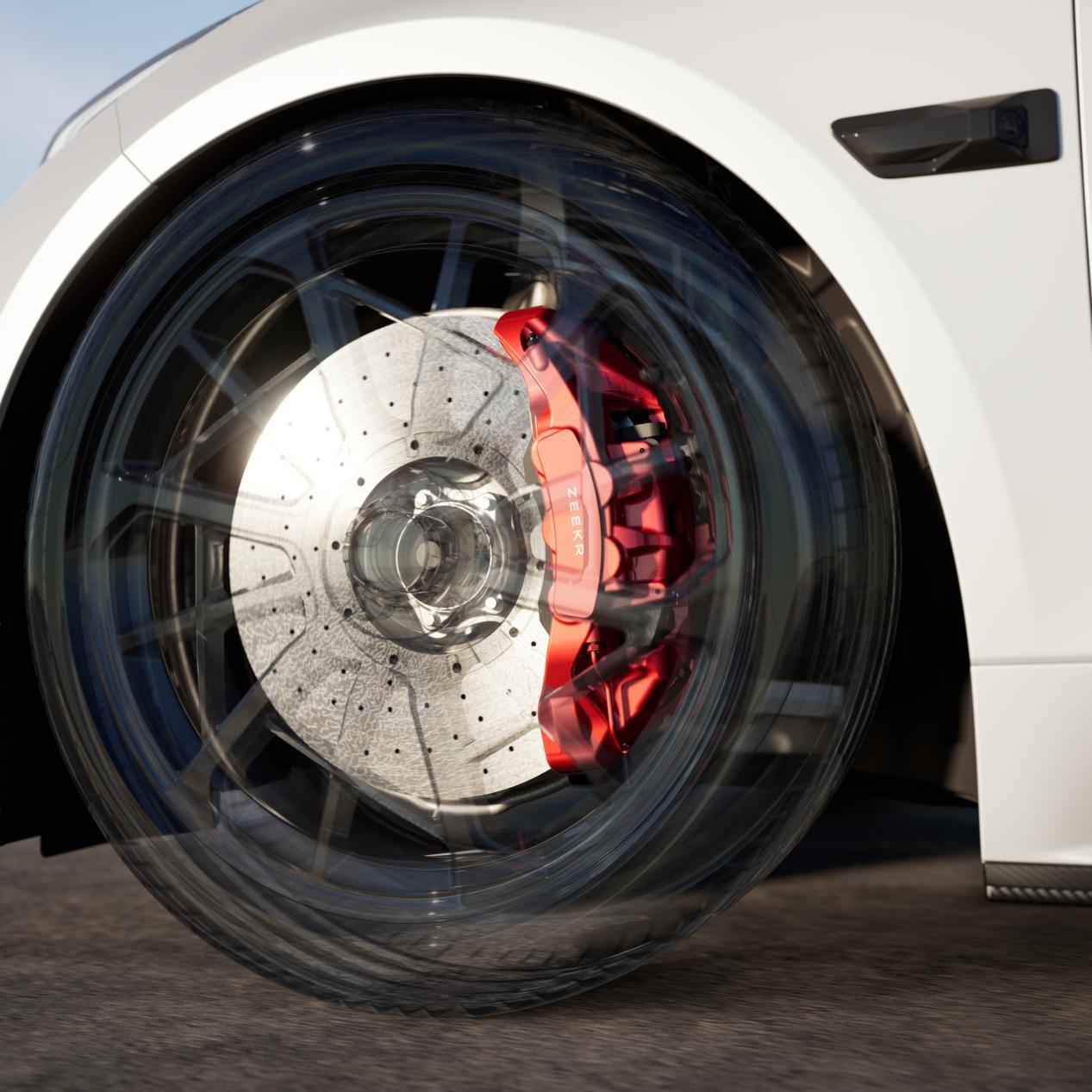 原厂标配AP Racing 十活塞锻造铝制动卡钳、赛车专属超大尺寸Brembo碳陶打孔制动盘的装备,让极氪001 FR冲进两秒俱乐部的同时,100-0公里/小时制动距离仅为33.4米,即便长时间激烈驾驶,也能保持最好的制动状态。