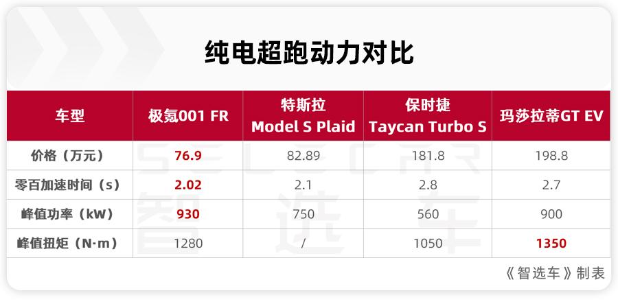 从动力性能来看,极氪001 FR零百加速2.02s的成绩领先特斯拉Model S Plaid版,并且与价格贵了一百来万的保时捷Taycan Turbo S 、玛莎拉蒂GT EV等车型相比,也有一定的优势。