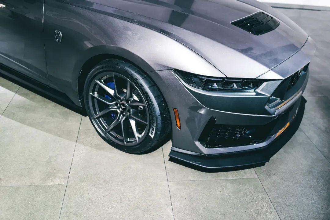 从外观造型上,我们就能一眼认出这辆福特Mustang Dark Horse,首先是一个非常有质感的碳素灰配色,在光线下显得很威武。头灯加入了三个LED灯条很是凌厉,而在前格栅两侧有专为V8自吸发动机设计的专属双进气道。在翼子板上,出现了一个全新的Dark Horse专属徽章,车身布满大量空气动力学通道,车尾则是专属的大型尾翼以及气流扩散器。