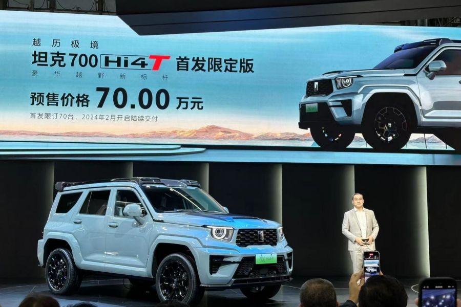 【车讯网 报道】 11月17日,2023广州车展现场,坦克700 Hi4-T开启预售,预售价为70万元。坦克700 Hi4-T搭载3.0T混动系统,造型延续家族“机甲科技”风格。