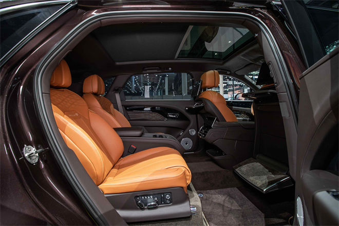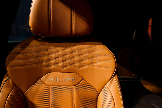 除了外观,内饰副驾驶中控面板、座椅,也镶嵌加入了MULLINER标识。升级标配的专属宾利航空级座椅套件,还具备22向调节,以及自动温度感应和舒逸按摩功能——放松模式下,座椅可向后倾斜接近40度;商务模式下,后排座椅回正到直立状态,比在售车型更大、更奢华。