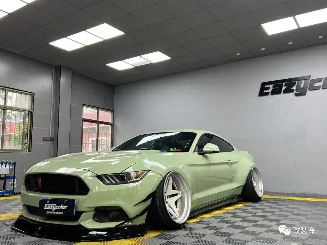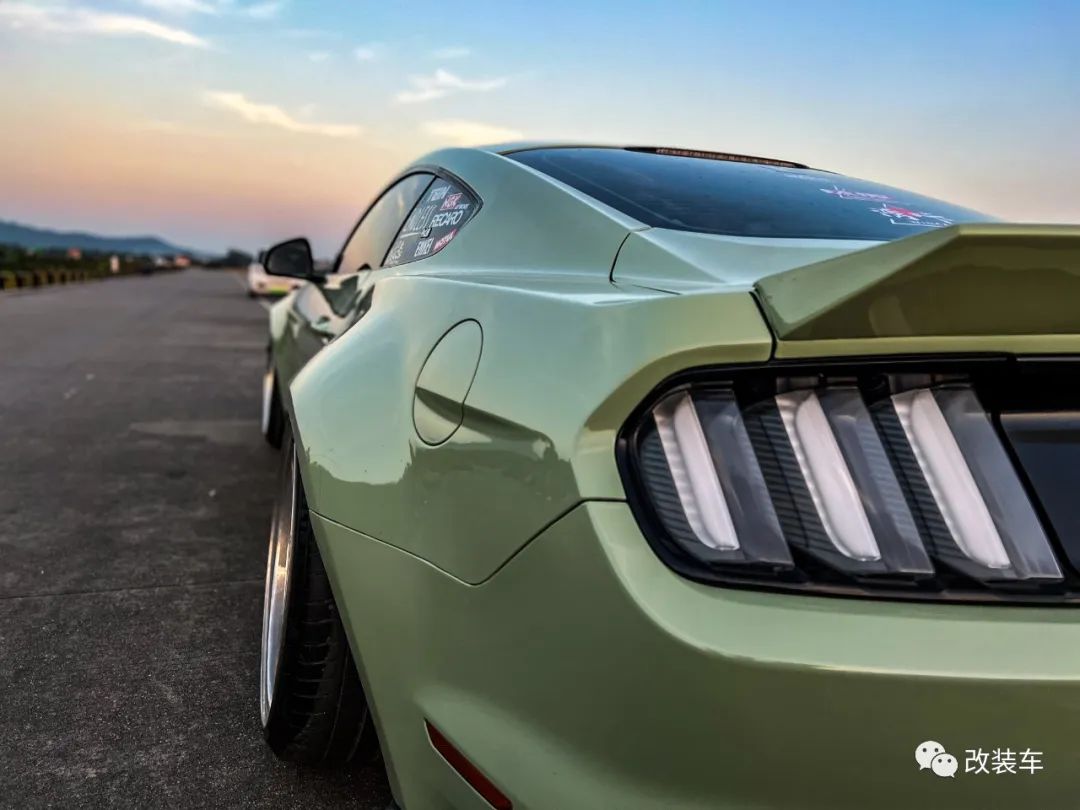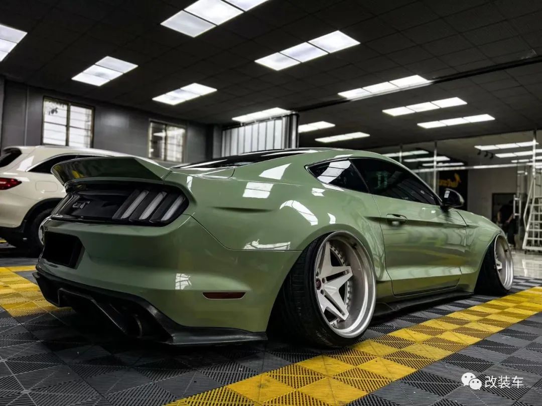 "外观方面,换上了手工宽体、AC前唇、AC后扰流、DIY风刀、碳纤维侧裙、CD尾翼,最后贴上了一身卡其绿改色膜,整体搭配的还是蛮协调的,宽体的加持让这辆Mustang像是位‘肌肉猛男’。"