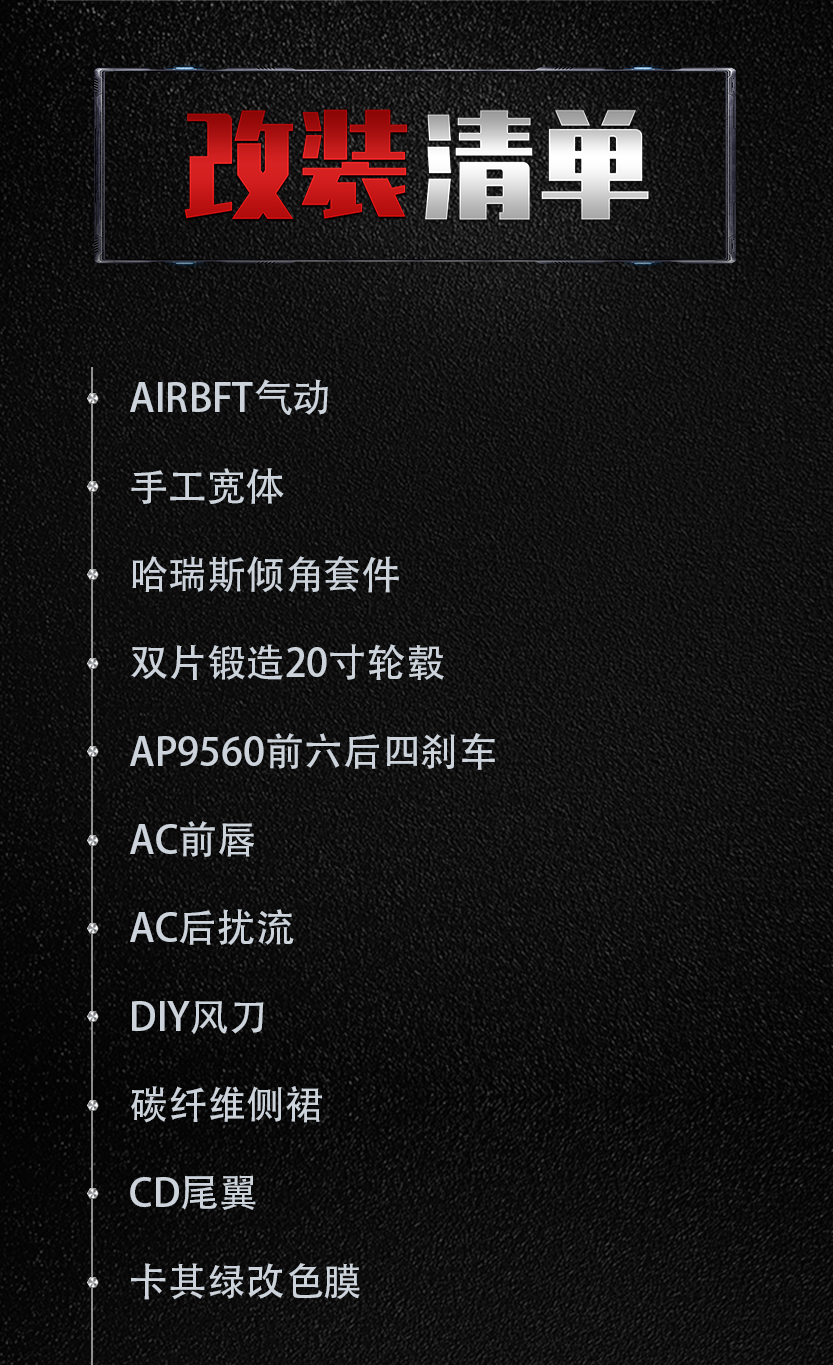 "买车后因为疫情的原因,就一直放在停车场没怎么开,都已经放到脱审了一段时间……等后来放开后才就是对它动手!那话不多说,咱们直入主题!首先是行走部分,换上了AIRBFT气动、双片锻造20寸轮毂、AP 9560前6后6刹车卡钳,搭配上HARDRACE倾角套件做出了个比较满意的姿态效果。"