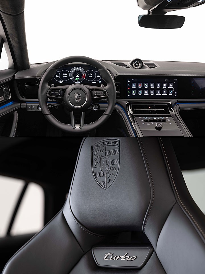 Panamera Turbo E-Hybrid 外观则具备专属后保杠搭配车身烤漆下扰流,以及车身同色专属前保杠。此外,也具备深铜色排气尾管以及选配的中央单一锁定设计轮圈。窗框、尾门上的 Turbo 字标以及前厢盖、轮圈和方向盘上的盾徽,都以 Turbo 车型专属的涡轮黑(Turbonite)设定。在车内,涡轮黑融合碳纤维元素打造运动化的车室氛围,包含仪表板中央的转速表,以及中控台上的控制键都能见到涡轮黑的点缀。