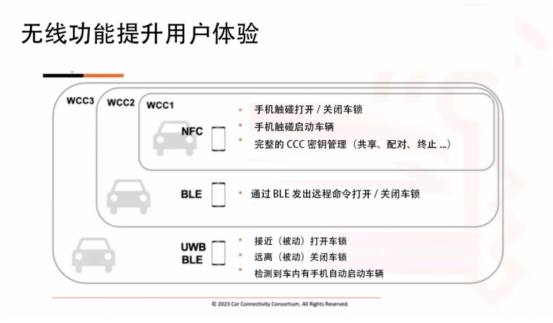 CCC构建的解决方案是一个长期的、向前兼容的解决方案。第一批支持NFC的手机是在2020年推出的。现在,2023 年、2024 年可能会有同样支持超宽带的新车发布。而那些只支持车门把手轻触NFC的旧手机,仍然可以在超宽带的新车上使用。